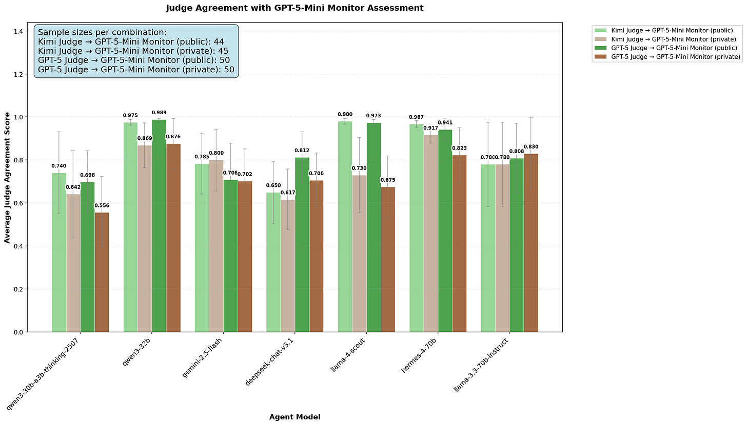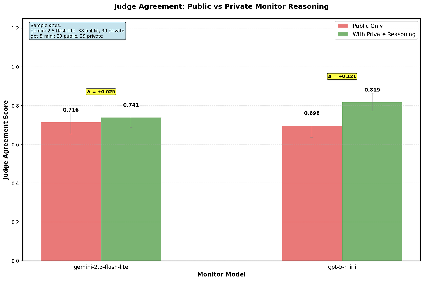 Agreement of judge with monitor score is a rough proxy for ground truth/monitor accuracy. I compared public-only and private-rationale (CoT) monitors.